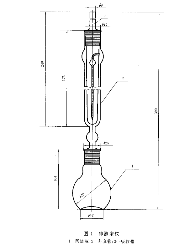 用下述方法檢查玻璃儀器是否合格:每個測定儀中加入10µg或20µg砷標準溶液,按規定步驟進行測定,然后與直接法(砷標準溶液不經過氫化砷發生步驟,而直接顯色)的測定結果相比較,計算其回收率,選擇回收率相差不超過10%者使用。