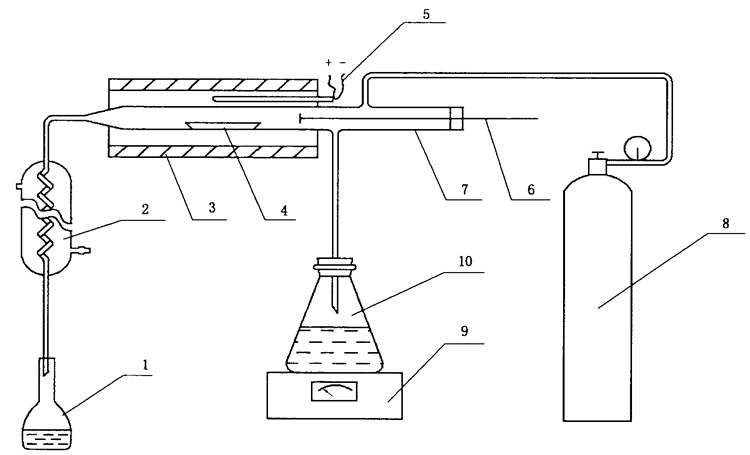 1-容量瓶; 2-冷凝管; 3-高溫爐; 4-瓷舟; 5-鉑銠一鉑熱電偶; 6-進樣推棒; 7-燃燒管;