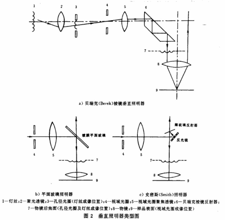 可選用貝瑞克棱鏡、鍍模平面玻璃或史密斯照明器(反光鏡和平面玻璃的組合)之一種。它們的光路示于圖2