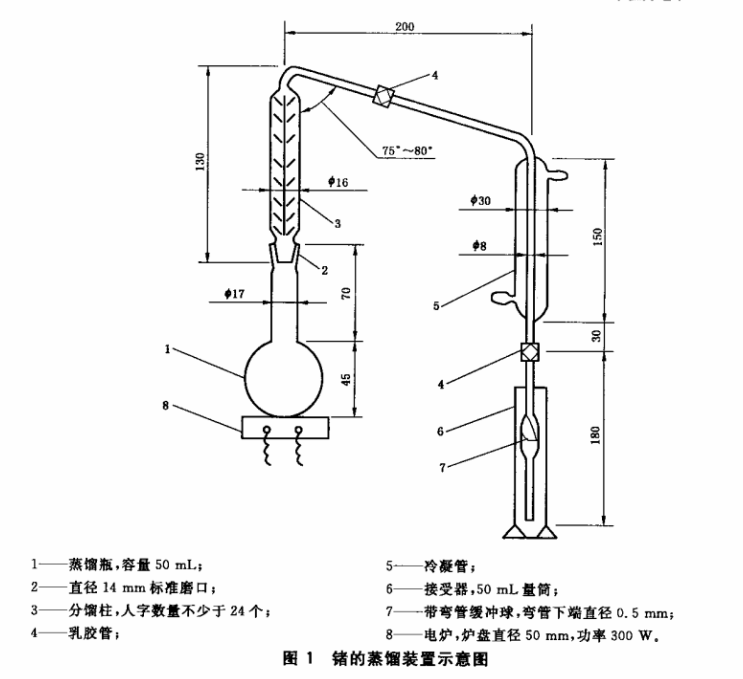 將灰分解物(包括空白)倒入蒸餾瓶中,并用7 mo1/L鹽酸15mL分3次沖洗坩堝,每次約5mL,并將洗液收集在同一個蒸餾瓶中,加入硼酸約0.2g,然后按圖連接。往接受器中加入10mL水,并使冷凝管尾端浸入水中,往冷凝管通入冷卻水,用電爐加熱蒸餾瓶,保持1.5~2mL/min的蒸餾速度,當餾出液達10mL時立即停止蒸餾。然后卸開分餾柱和冷凝管連接處,用少量水沖洗冷凝管及其尾端,并將洗液和接受器中的溶液一并收集到50mL的容量瓶中。