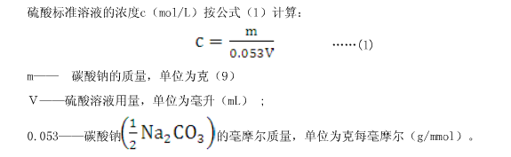 標定:稱取0.02g(稱準至0.0002g)預先在130ºC下干燥到質量恒定的碳酸鈉純度標準物質放入錐形瓶中,加入50mL~60mL蒸餾水使之溶解,然后加入2~3滴甲基橙,用標準硫酸溶液滴定到由黃色變為橙色。煮沸,趕出二氧化碳,冷卻后,繼續滴定到橙色。